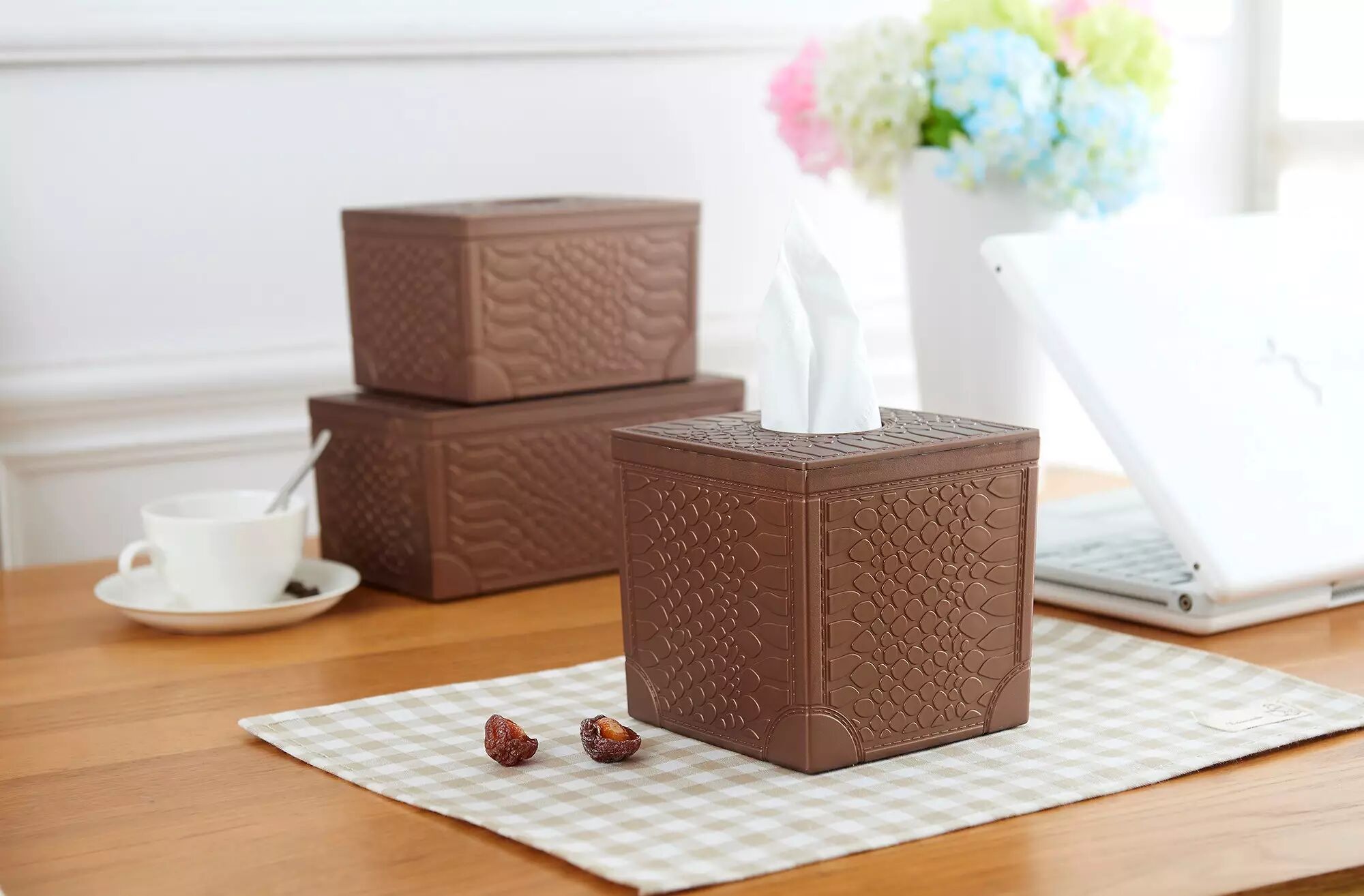 1.优质环保PP材质,安全卫生,坚固耐用;2.盒盖分离,轻松安装,便于换纸;3.卡盒边缘凸条设计,卡扣更牢固;4.流线型抽纸口设计,柔和圆润,不伤手;5.底部加高垫脚设计,防止底面刮花。